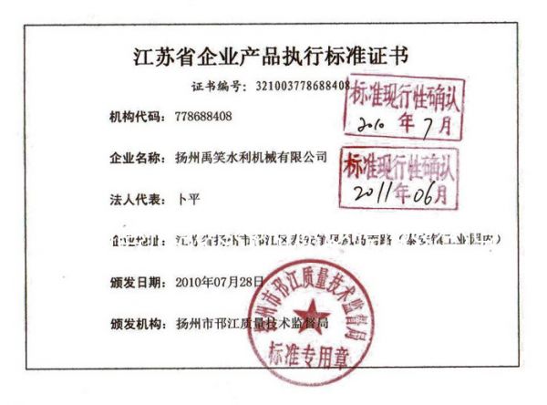 江苏省企业产品执行标准证书
