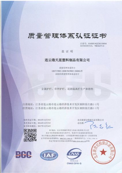 天星护栏(连云港天星塑料制品有限公司)成立于2006年,是国内领先的护栏研发生产厂家,公司拥有硕士及以上学历科研人员二十余人,专业技术骨干百余人,实现千人规模化生产,物流车队全国畅通,能够在最短的时间内为客户提供完整的解决方案,满足护栏客户的全部需求。公司依托12年的丰富的生产技术经验,注重产品研发,根据中国及国际护栏行业的现状和发展趋势,以PVC、锌钢、铝合金为材质,自主开发出数百种护栏及配套产品,如道路护栏、草坪护栏、河滨护栏、小区护栏、围墙护栏、阳台护栏、楼梯护栏及马场护栏等,是中国当前品种最齐全,规模最大的护栏生产基地之一。 公司一贯注重科技应用,以质量为本求生存、谋发展,本着高起点、高标准、高水平、高质量的原则,采用一流设备,引进一流技术,建立一流机制,生产一流产品。产品经权...... [ 查看详情 ]